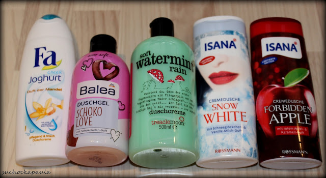 Jako że zapasy żeli pod prysznic "troszkę" się uszczupliły, postanowiłam je szybciutko uzupełnić ! Pięknie pachnącym FA ♥ Ukochanym SchokoLove ♥ Nowością od Treaclemoon ( chyba już nie raz wspominałam że kocham Treaclemoon prawda ? :D hihi ) . A do tego dwa zapachy które zachwyciły nie tylko mnie ( mój Luby też pokochał je od pierwszego wąchnięcia - Wasi faceci też Wam podkradają żele ? :D ) Isana Snow White i Forbidden Apple ♥